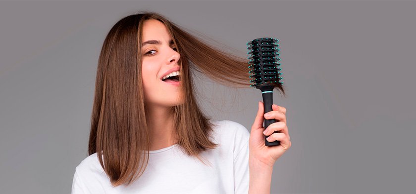 - Ve dnech s nejvyššími hodnotami vlhkosti vzduchu zajistí fén a kulatý hřeben vašim vlasům dlouhotrvající hladkost. Naneste spolehlivou tepelnou ochranu, vlasy řádně vysušte a poté pokračujte v procesu narovnávání: každý pramen stáhněte hřebenem a vysušte fénem.