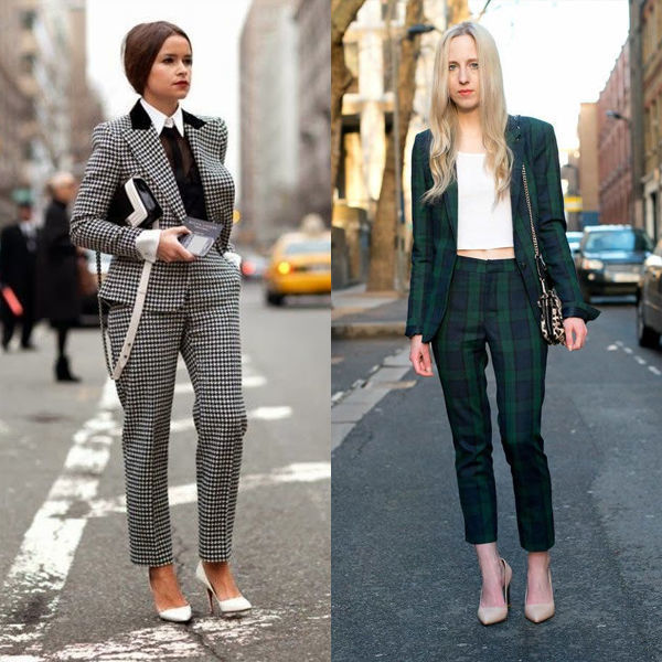 Obleky s culottes nebo kotníčkovými kalhotami vypadají úžasně v kombinaci s botami D’Orsay. Kontrast širokých nohou, tenkých kotníků, špičatých prstů a otevřené klenby dodává ženám křehkost a eleganci. Obleková látka s tenkými svislými pruhy nebo prodloužené dvouřadé sako pomůže prodloužit siluetu.