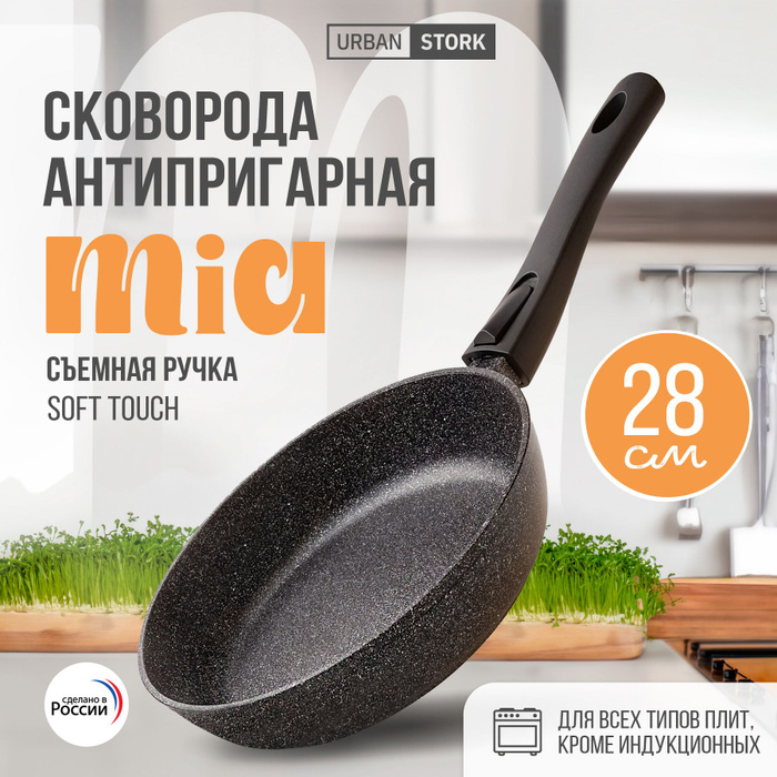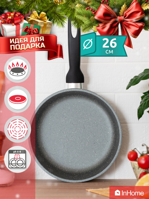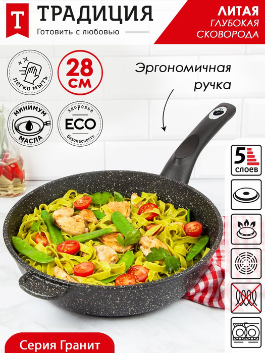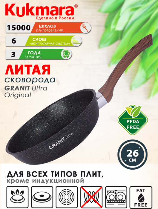 Do granitového nepřilnavého povlaku jsou přidány keramické třísky, které zvyšují životnost nádobí. V řadě je pět nejoblíbenějších velikostí – s průměrem 20, 22, 24, 26 a 28 cm.Okamžitě můžete zakoupit s víkem i bez a vybrat si barvu potahu – černá, šedá, hnědá, žula.
